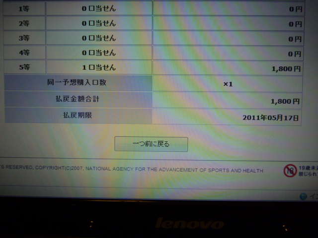 何のけなしに先週に初めて買った「TOTO BIG」が当たりました とは言っても5等ですが 1口(300円)買って1800円だから効率は良いだろ! 次は夢の6億円ダァ~