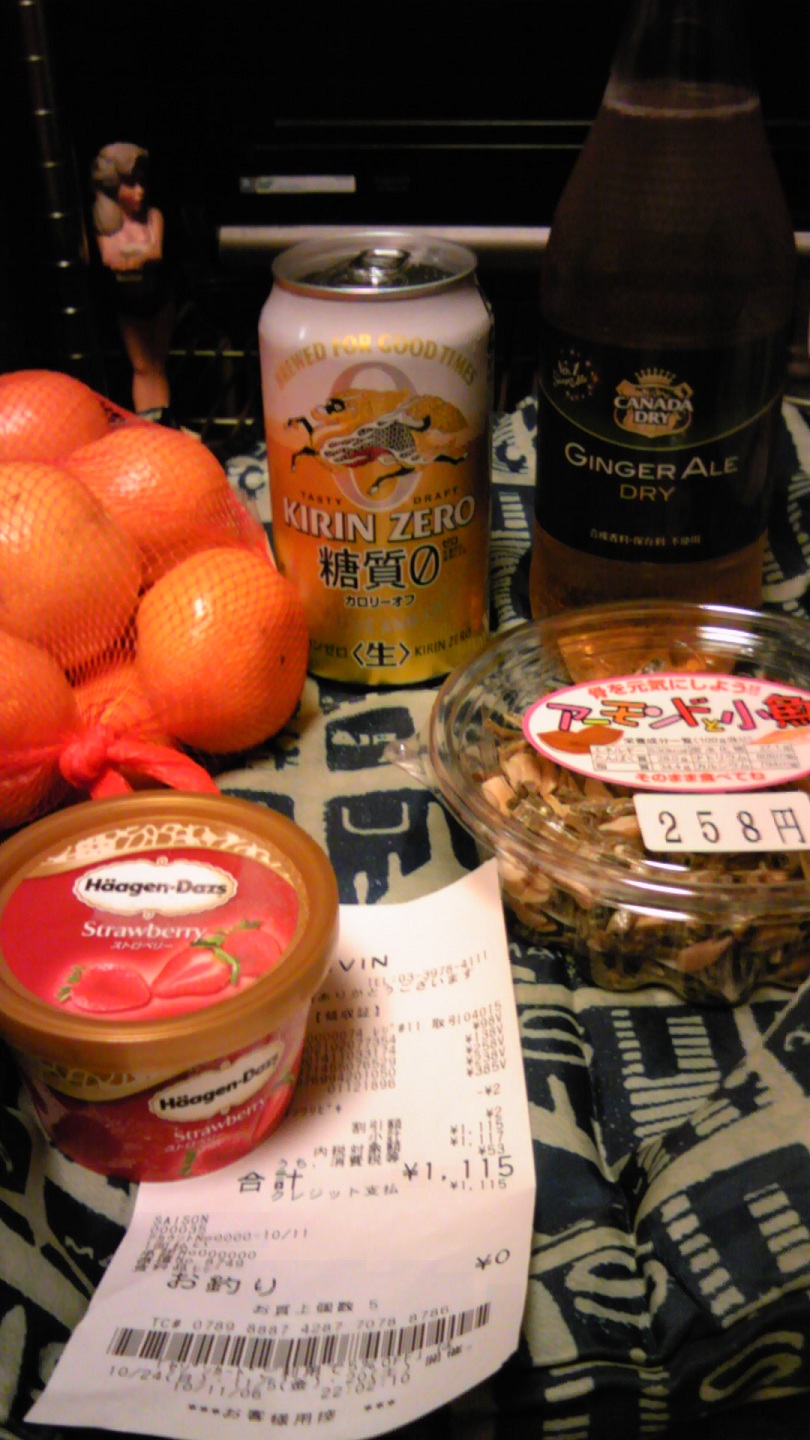 発泡酒・ジンジャエール・アーモンド小魚・ハーゲンダッツ・ミカン